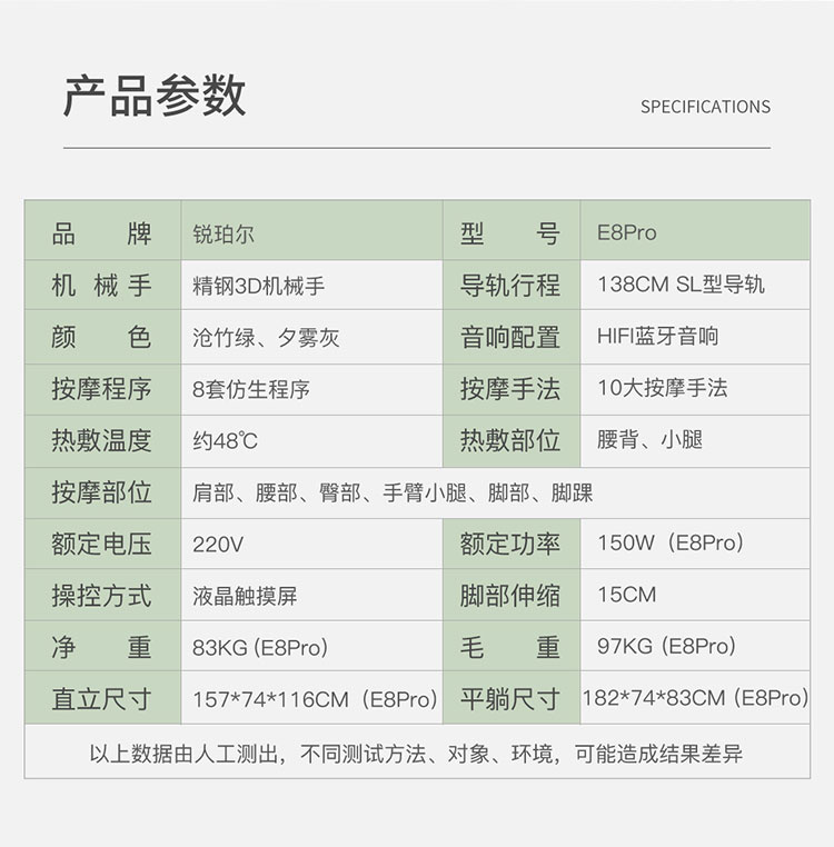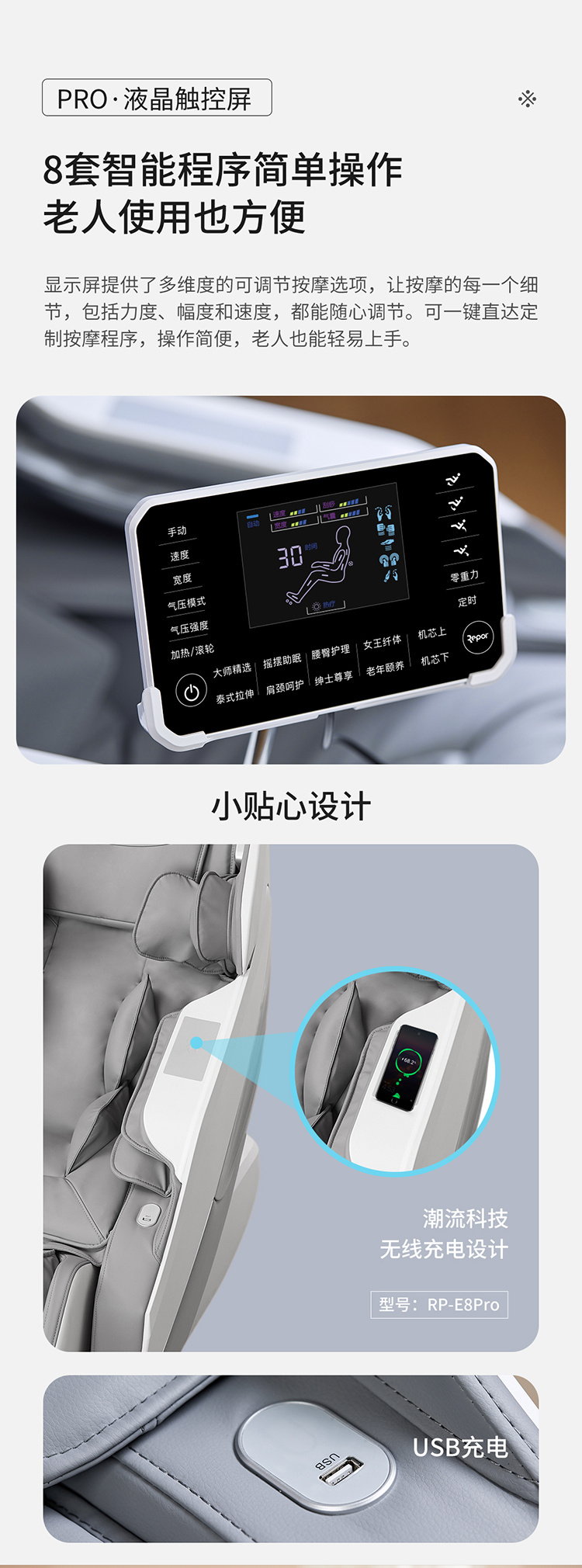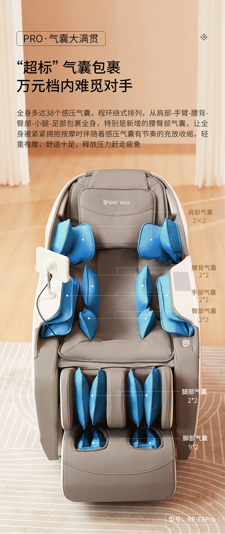 锐珀尔集十余年技术积累,倾力打造锐珀尔新款按摩椅4D穴感总裁椅,拥有全新的AI智能语音,小腿温热揉搓、脚底震动、4D机械手等全新功能创新,智能健康体测,可以检测血氧、心率、微循环等数值,通过大数据分析,给您提供合理的改善方法,时刻关注您的健康状况;超大液晶智能触控,专为总裁量身打造的特色按摩程序,20分钟快速补充精力,多种按摩程序,满足全家人的需求。