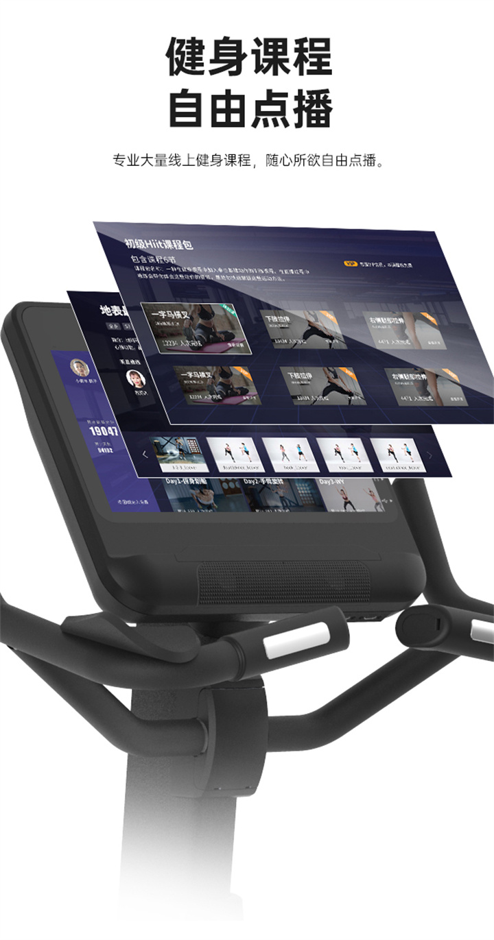 舒华立式商用健身车SH-B9100U(V10)触屏版拥有超大显示和操作屏幕, 可以任意设置阻力、时间和距离等参数,还可以即时显示心跳和转速等数据,同时,SH-B9100U提供多项科学运动处方,更轻松掌握运动节奏。